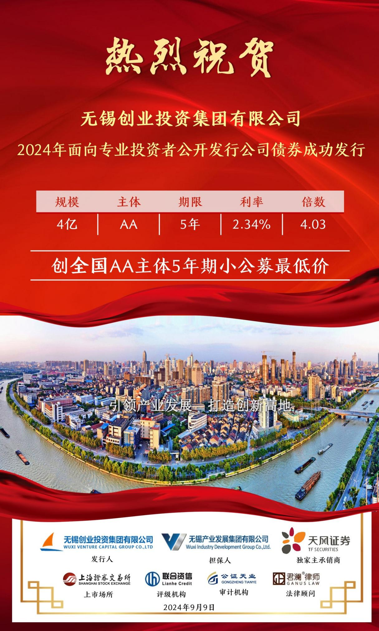 9月9日,無(wú)錫創(chuàng)業(yè)投資集團(tuán)有限公司(簡(jiǎn)稱(chēng)“無(wú)錫創(chuàng)投集團(tuán)”)2024年面向?qū)I(yè)投資者公開(kāi)發(fā)行公司債券“24錫創(chuàng)01”成功發(fā)行,發(fā)行規(guī)模4億元,發(fā)行期限5年,認(rèn)購(gòu)倍數(shù)4.03倍,票面利率2.34%,創(chuàng)全國(guó)可比債券歷史發(fā)行最低利率!本期債券由天風(fēng)證券承銷(xiāo),主體評(píng)級(jí)AA,債項(xiàng)評(píng)級(jí)AAA。 無(wú)錫創(chuàng)投集團(tuán)作為無(wú)錫產(chǎn)業(yè)集團(tuán)旗下的創(chuàng)業(yè)投資和股權(quán)投資平臺(tái),近年來(lái)在集團(tuán)的正確領(lǐng)導(dǎo)和大力支持下,圍繞無(wú)錫“465”現(xiàn)代化產(chǎn)業(yè)集群建設(shè),聚焦產(chǎn)業(yè)集團(tuán)“1+4+X”產(chǎn)業(yè)布局,持續(xù)深化產(chǎn)融協(xié)同合作,不斷提升資金使用效率,努力為公司高質(zhì)量發(fā)展提供更低成本、更長(zhǎng)周期、更加靈活的資金支持。未來(lái),公司將繼續(xù)承擔(dān)國(guó)企社會(huì)責(zé)任,勇挑重?fù)?dān),發(fā)揮自身優(yōu)勢(shì),持續(xù)為無(wú)錫新質(zhì)生產(chǎn)力和實(shí)體經(jīng)濟(jì)高質(zhì)量發(fā)展注入新活力、增添新動(dòng)能。 |